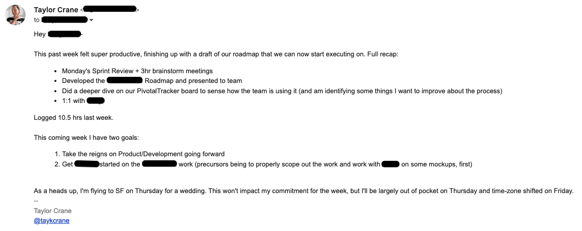 A strong weekly update is simple to read and quickly shows your value. It should take no more than a few minutes for you to write and a few minutes for your client to read.